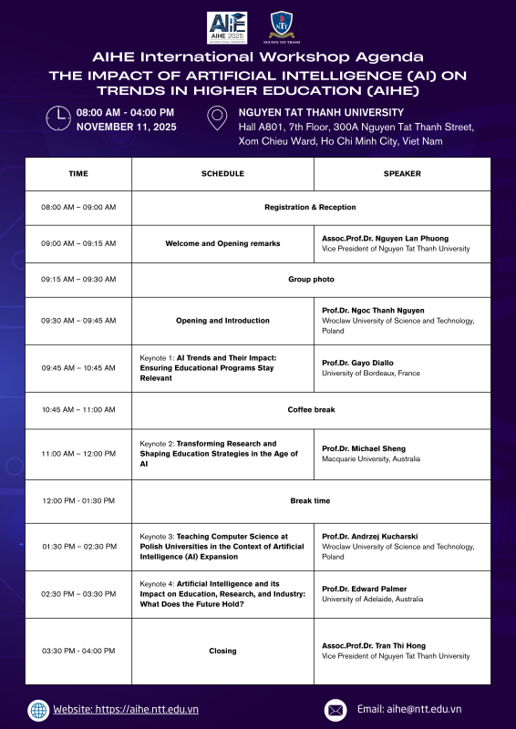 In response to these transformative changes, Nguyen Tat Thanh University is organizing the International Workshop “The Impact of Artificial Intelligence (AI) on Trends in Higher Education (AIHE)”. This workshop provides an important platform for experts, faculty, and education leaders to explore AI’s impact, exchange insights, and foster innovation in teaching, learning, and governance — toward building a more modern and effective higher education system.